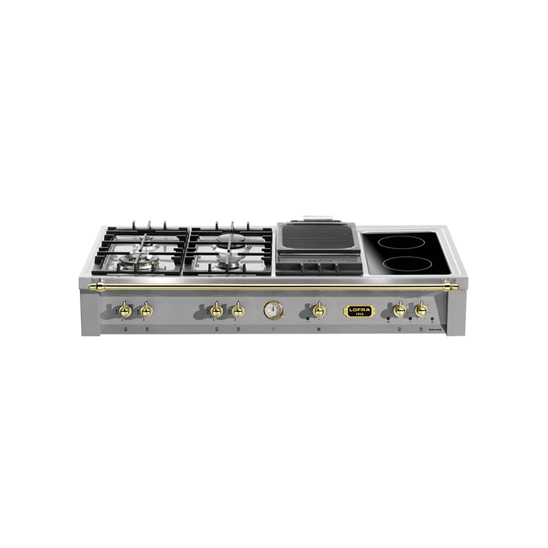 LOFRA TRS126/4BC Range Top Dolce Vita da incasso 120 cm - colore Acciaio Inox, finiture color ottone - 3 fuochi a gas valvolati - 1 Dual - protezione Gas-Stop - 1 piastra BBQ - 1 piastra in vetroceramica a due zone. Dimensioni: 120x60x20 cm. Optional: piastra Teppanyaki. Disponibile anche con finiture in bronzo o cromate.