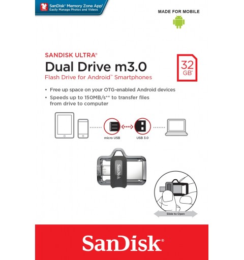 SanDisk Ultra Dual m3.0, 32 GB, USB Type-A / Micro-USB, 3.2 Gen 1 (3.1 Gen 1), Dia, 5,2 g, Schwarz, Silber, Transparent