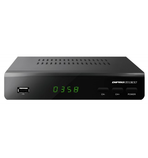 DIPROGRESS DPT203HD. Signalquelle: Satellit, HD-Typ: Full HD, Digitales Signalformatsystem: DVB-T2. Unterstützte Videoformate: AVC,AVI,H.264,H.265,HEVC,MKV,MP4,MPEG2,MPEG4, Unterstützte Audioformate: MP3, Unterstützte Bildformate: BMP,JPEG. Produktfarbe: Schwarz, Tunertyp: Digital, Anzahl der Tuners: 1 Signalempfänger. AC Eingangsspannung: 12 V