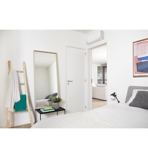 Das flache und elegante Frontpanel fügt sich problemlos in jedes Einrichtungskonzept ein und ist leichter zu reinigen. Das Wi-Fi ermöglicht die Steuerung der Inneneinheit von überall aus über eine App, ein lokales Netzwerk oder das Internet. Saisonale Effizienzwerte bis zur Klasse A++ im Kühlbetrieb. Die Wahl eines Produkts mit R-32 reduziert die Umweltbelastung um 68% im Vergleich zu Systemen mit R-410A und führt zu einer direkten Reduzierung des Energieverbrauchs durch hohe Energieeffizienz.