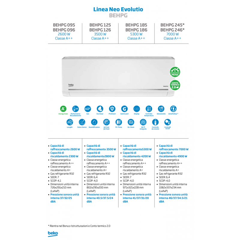 Beko BEHPG125 + BEHPG126 Klimaanlage 12000Btu A++/A+ 3,5Kw WIFI Evolutio 2024, R32 Inverter, Weiß - Neuheit