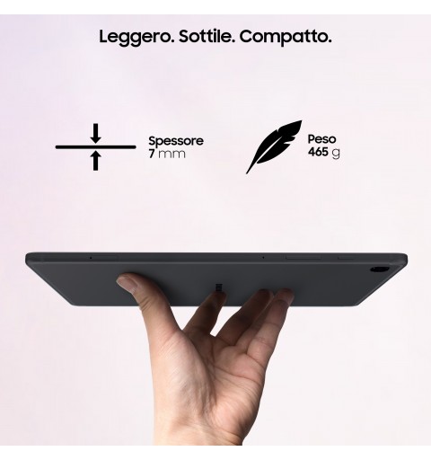 Leggero. Sottile. Compatto. Dotato di una scocca in metallo, Galaxy Tab S6 Lite è anche sottile e leggero, per poter entrare anche in una piccola borsa, per il massimo livello di portabilità e uno stile minimalista.
