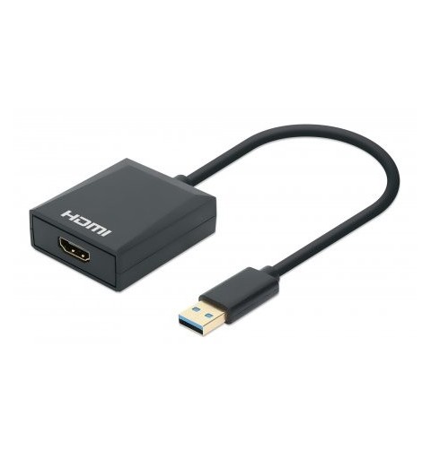 Manhattan USB-A to HDMI Cable, 1080p@60Hz, Converts USB 3.2 Gen1 (aka USB 3.0) signal to HDMI, 15cm, Black, Male to Female, Three Year Warranty, Retail Box, Wired, USB 3.2 Gen 1 (3.1 Gen 1) Type-A, Black, 1920 x 1080 pixels, 60 Hz, Plastic