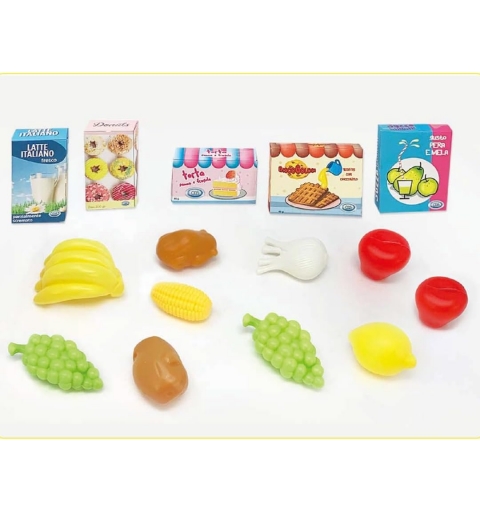 CONTENT OF CONFETION: The package includes a custom trolley 40 x 30 x 39 cm and 16 food accessories, including bananas, apples, grapes, chicken, bread, orange, bacon, cabbage, lemon and cans. Ideal for children from 2 years.