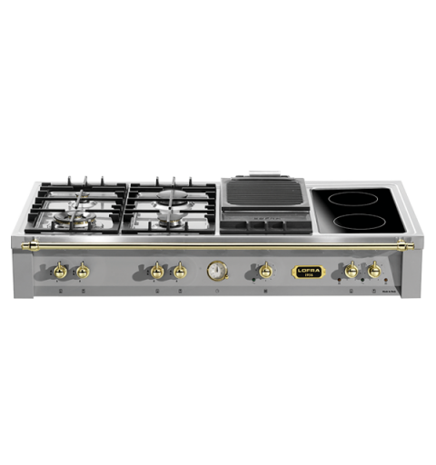 LOFRA TRS126/4BC Range Top Dolce Vita da incasso 120 cm - colore Acciaio Inox, finiture color ottone - 3 fuochi a gas valvolati - 1 Dual - protezione Gas-Stop - 1 piastra BBQ - 1 piastra in vetroceramica a due zone. Dimensioni: 120x60x20 cm. Optional: piastra Teppanyaki. Disponibile anche con finiture in bronzo o cromate.