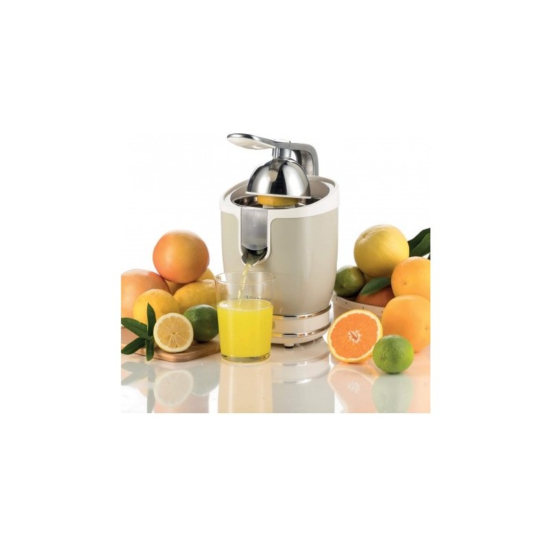 Spremiagrumi Elettrico con Leva della Linea Vintage Ariete Potente, silenzioso e dal design inconfondibile: lo Spremiagrumi Elettrico Vintage arrederà la tua cucina con lo stile retrò e shabby chic tipico della Linea Vintage di Ariete, grazie al suo resistente corpo in metallo e alle sue preziose finiture cromate. In dotazione avrai a disposizione 2 coni per frutti grandi e piccoli: il cono grande in Acciaio Inox ideale per arance e pompelmi e il cono piccolo dotato di perno per bloccare comodamente anche i frutti più piccoli, come limoni e lime. Lo spremiagrumi con leva a pressione schiaccia con facilità i frutti e ti assicura una spremitura professionale. Il beccuccio salvagoccia in Acciaio Inox evita sprechi di succo e ti garantisce una pulizia impeccabile delle superfici di appoggio. Una spremuta di arancia a colazione è perfetta per fare il pieno di Vitamina C, sali minerali ed energia!