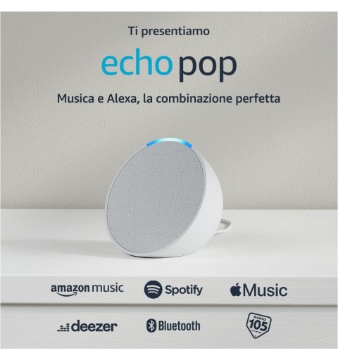 Musica e Alexa, la combinazione perfetta Scegli il colore che più si addice al tuo stile, trova il punto migliore dove posizionare Echo Pop e riproduci la canzone perfetta per ogni momento, goditi la totale libertà del controllo vocale con Alexa.