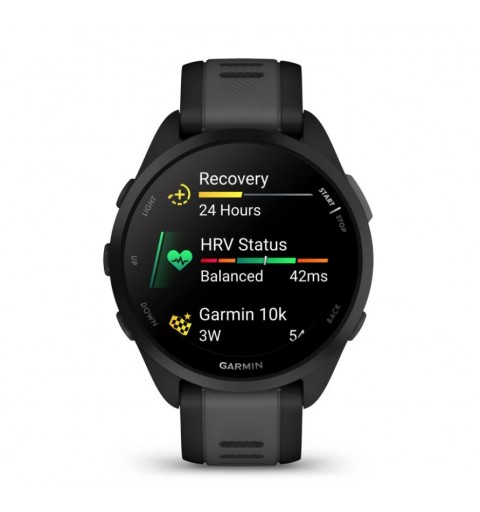 Garmin Forerunner 165. Display diagonal: 3.05 cm (1.2"), Display technology: AMOLED, Display resolution: 390 x 390 pixels, Touchscreen. GPS (satellite). Weight: 39 g. Band material: Silicone, Band colour: Black, Grey