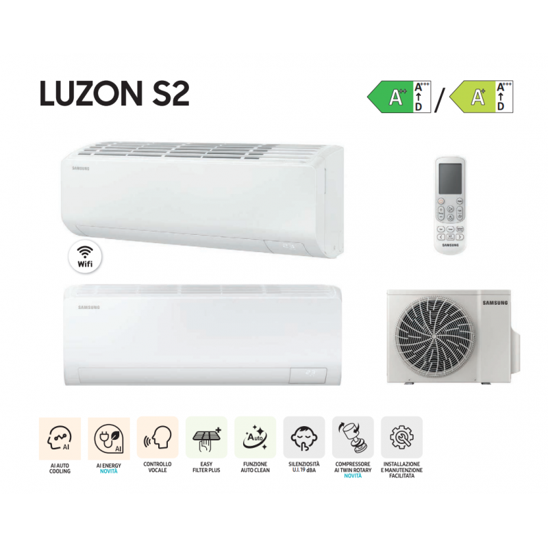 The Samsung Luzon S2 18000 BTU (Indoor Unit AR50F18C1BHNEU + Outdoor Unit AR50F18C1BHXEU) is a wall-mounted split air conditioner with heat pump and AI Twin Rotary Inverter technology. Designed for medium to large rooms, it ensures year-round comfort thanks to high performance, quiet operation and intelligent energy management via built-in WiFi.