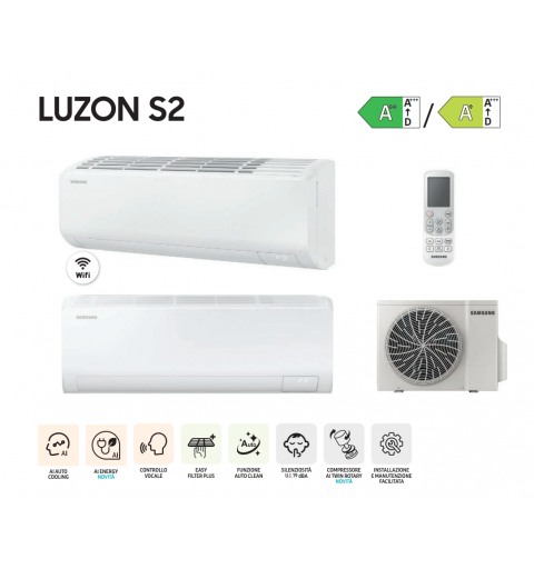 Samsung F-AR09LZ2 Luzon S2 Monosplit 9000 BTU - 2,6Kw - Kit AR50F09C1BHXEU + AR50F09C1BHNEU Aire acondicionado fijo, Sistema split, Blanco, Refrigeración, Deshumidificación, Ventilación, Calefacción, 2500 W, Mono split