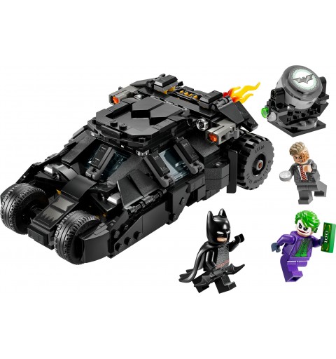 Este juego LEGO Batman viene con 3 populares minifiguras: Batman (armado con su Batarang™), The Joker (sosteniendo un fajo de billetes) y Two-Face (con su característica moneda de plata). Abre el Batmóvil Tumbler y descubre un cuadro de mandos y un habitáculo con espacio para Batman. Del tubo de escape sale un elemento extraíble que representa una llama. La Batseñal (no se ilumina) se inclina y gira 360° en ambas direcciones. Para disfrutar también de diversión digital, los constructores pueden acercar y girar versiones 3D de sus modelos en la intuitiva app LEGO Builder.