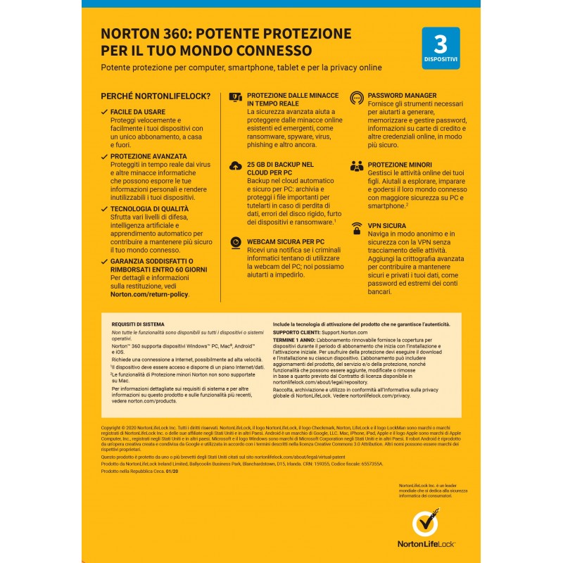 Norton 360 Deluxe offre una potente protezione potenti per i tuoi dispositivi e la tua privacy online – tutto in un'unica soluzione. I tuoi PC, Mac®, tablet e smartphone vengono protetti da virus, ransomware, phishing e altre minacce online mentre effettui transazioni bancarie, fai acquisti e navighi online.