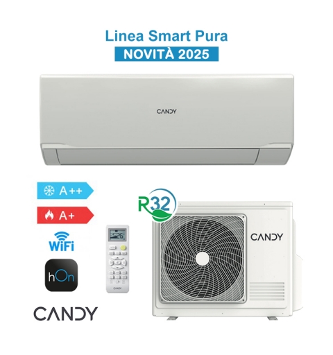 Climatiseur intelligent Candy, modèle Pura 2025. Unité murale monosplit avec WiFi intégré, au très bon rapport qualité-prix.