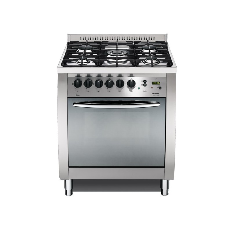 Lofra C76GV/C. Type de produit: Cuisinière, Couleur du produit: Acier inoxydable, Type de commande: Rotatif. Type de plaque: Cuisinière à gaz, Position du brûleur Wok: Au milieu, Matériau de support de poêle: Fonte. Taille du four: Moyenne, Source d'alimentation du four: Electric,Natural gas, Capacité brute du four: 66 L. Classe d'efficacité énergétique: A, Consommation d'énergie (conventionnelle): 1,74 kWh. Largeur: 700 mm, Profondeur: 600 mm, Hauteur: 905 mm