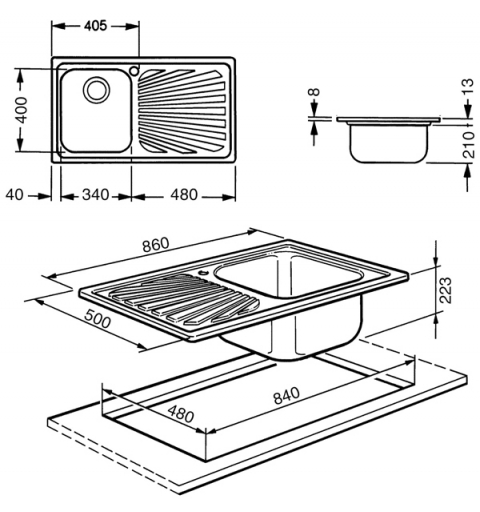 Smeg SP861S, Evier encastré, Rectangulaire, Acier inoxydable, Acier inoxydable, 1 bols, 340 x 400 mm