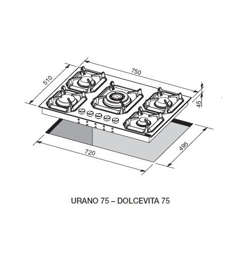 Lofra Dolcevita 75. Conception de caisse: Intégré, Type de plaque: Cuisinière à gaz, Type de surface extérieure (dessus): Acier inoxydable. Type de commande: Rotatif, Position de contrôle: En haut devant. Largeur: 750 mm