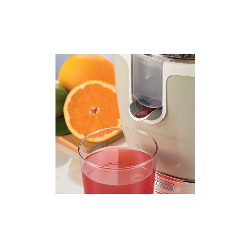 Usa lo spremiagrumi elettrico Vintage con il cono piccolo per una limonata corroborante, spremi il succo di due limoni, aggiungi un cucchiaino di miele, una fettina di zenzero e rinfresca il tutto con qualche cubetto di ghiaccio: la tua spremuta di vitamine è pronta in pochi istanti!
