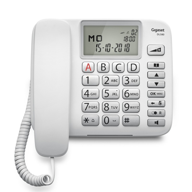 Gigaset DL580, Téléphone analogique, Combiné filaire, Haut-parleur, 99 entrées, Identification de l'appelant, Blanc