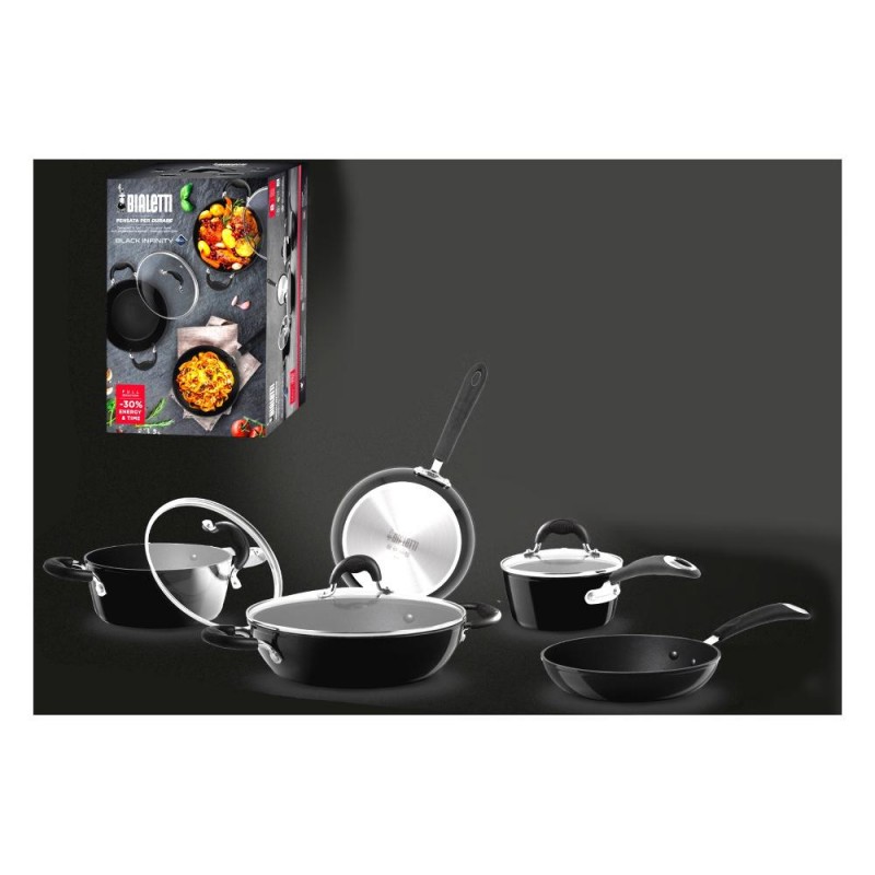 Set composto da: Padelle 24e 28 cm, Casseruole 16 e 20 cm, Tegame 28 cm, Coperchi 16/20/28 cm. Massima efficienza e comfort di utilizzo, possiede un fondo ad induzione realizzato tramite l’innovativa tecnologia Full Induction. Il rivestimento è costituito da 5 strati professionali che superano i più stressanti test di abrasione Il manigliame in silicone soft touch, con anima in acciaio, resistente fino a 200° anche in forno, riduce la distribuzione del calore