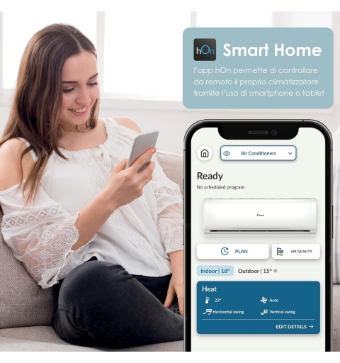 Grazie all’app hOn, potrai gestire Pura direttamente dal tuo smartphone o tablet. Accendilo e spegnilo, regola la temperature e le impostazioni ovunque ti trovi. In più, potrai programmare l’accensione e lo spegnimento in base alle tue necessità, impostare un determinato Mode per un periodo prestabilito (come l’Holiday Mode), monitorare le previsioni del tempo e molto altro ancora.