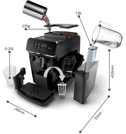 Philips Series 2200 3 bevande, macchina da caffè automatica, 1.8L , EP2230/10, Macchina per espresso, 1,8 L, Chicchi di caffè, Macinatore integrato, 1500 W, Nero