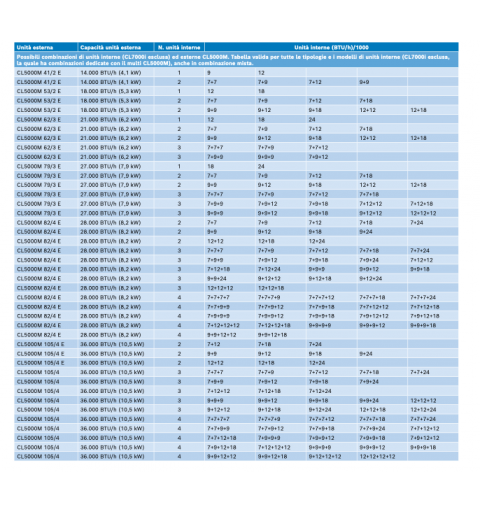 - 5 unità interne con telecomando Climate 2000: CL2000U W 26 E (9000btu) + CL2000U W 35 E (12000btu) + CL2000U W 35 E (12000btu) + CL2000U W 35 E (12000btu) + CL2000U W 53 E (18000btu)