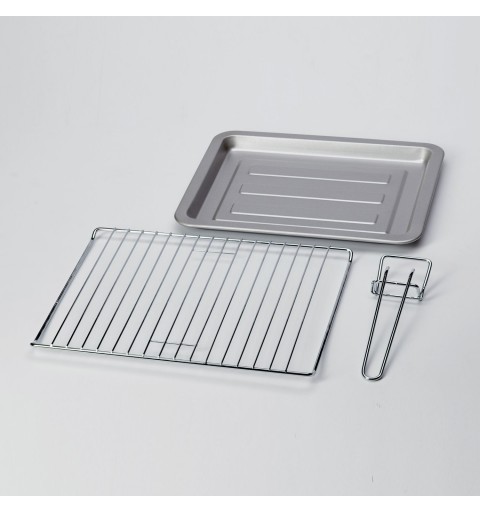 Forno elettrico con capacità 18 litri, perfetto per cuocere anche la pizza grazie al suo fondo allargato. Completo di griglia in acciaio e vassoio in alluminio, ha un timer regolabile fino a 60 minuti e 3 posizioni di cottura.