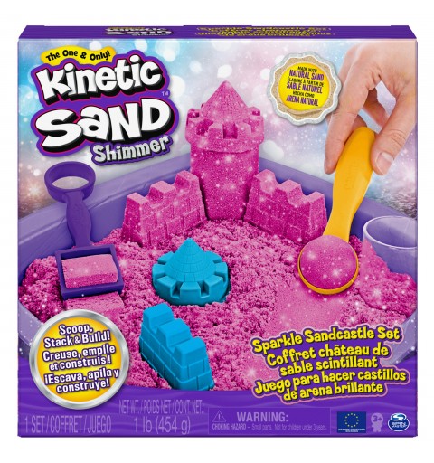 Kinetic Sand - Castello di sabbia glitterata, 453 g di Shimmer rosa, 5 formine e accessori con vaschetta - per bambini dai 3 anni in su. Colore del prodotto: Rosa, Età consigliata (min): 3 anno/i, Genere consigliato: Ragazzo/Ragazza, Senza glutine