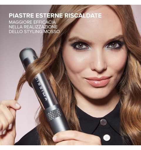 Piastra con superficie esterna riscaldata e tecnologia a ioni per creare capelli lisci e onde morbide o definite senza effetto crespo.