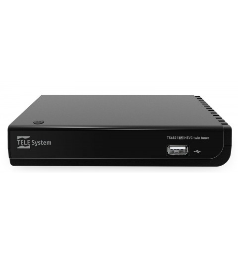 TELE System TS6821. Fonte segnale: Ethernet (RJ-45), Terrestre, Tipologia HD: Full HD, Formato del segnale digitale: DVB-T,DVB-T2. Formati video supportati: MPEG2,MPEG4, Formati di compressione video: AVC,H.264,H.265,HEVC, Formati audio supportati: AAC,MP3. Velocità trasferimento Ethernet LAN: 10,100 Mbit/s. Versione HDMI: 1.4a. Sistemi file supportati: FAT32
