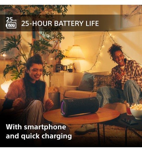 Cassa con 2 tweeter 2 Woofer e 2 Radiatori Passivi, Diametro Tweeter: 20 mm, Impedenza tweeter: 8O Tipologia unità woofer: X-Balanced Speaker, Dimensione woofer: 61mmx68mm (Full range), Impedenza woofer: 4O Amplificatore S-Master,Illuminazione radiatori passivi (disattivabile), Resistente ai liquidi e alla polvere IP67, Microfono integrato a Condensatore a elettrete Tipo Omnidirezionale, Maniglia retraibile Connessioni e alimentazione: Ingresso Presa AUDIO IN (minipresa stereo 3,5 mm), Porta USB tipo C per la ricarica della batteria Porta USB tipo A per la ricarica di altri device Alimentazione CC 5 V (utilizzando l’adattatore CA USB in dotazione collegato a una rete di alimentazione da 100 V - 240 V CA, 50 Hz/60 Hz) o utilizzando la batteria integrata agli ioni di litio, Batteria agli ioni di litio da 5200 mAh, Autonomia della batteria (durante l’uso della connessione BLUE TOOTH) circa 25 ore, Ricarica veloce: 10 min di carica per 70 min di riproduzione, Tempo di ricarica circa 5 ore (con alimentatore 1,5A), Modalità Stamina Mode Consumi Consumo in riproduzione: 17 W Consumo in Standby mode: 0,3 W
