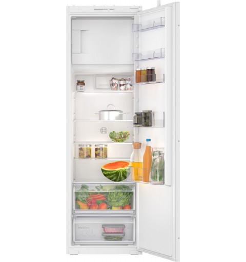 Bosch Serie 2 Frigorifero monoporta da incasso con congelatore, 177.5 x 56 cm. Posizionamento dell'apparecchio: Da incasso, Colore del prodotto: Bianco, Cerniera porta: Destra. Capacità netta totale: 280 L, Classe climatica: SN-ST, Classe emissione rumore: C. Capacità netta frigorifero: 246 L, Tipo di lampada: LED. Posizione del congelatore: Posto in alto, Capacità netta congelatore: 34 L, Capacità di congelamento: 2,5 kg/24h. Lunghezza cavo: 2,3 m