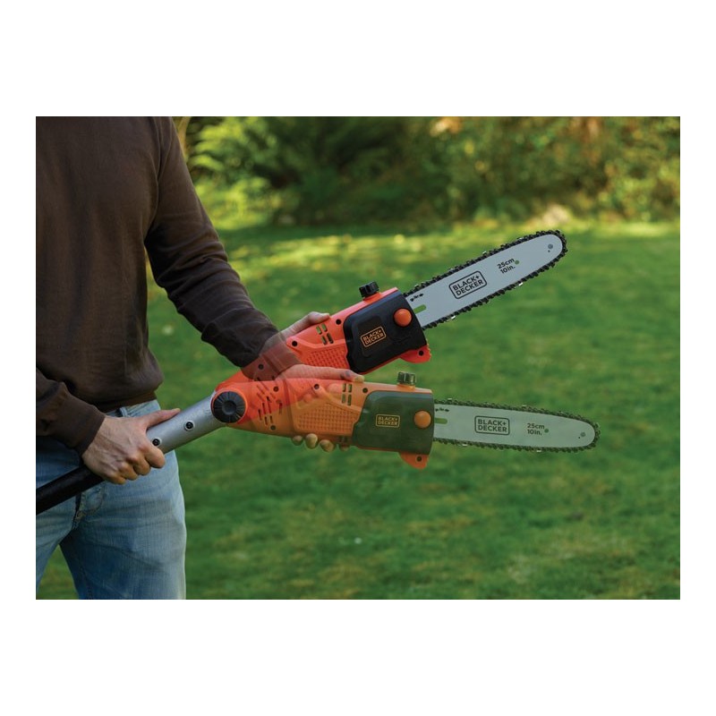 Black & Decker PS7525. Velocità di taglio: 11 m/s, Capacità del serbatoio dell'olio: 0,06 L, Colore del prodotto: Nero, Arancione. Alimentazione: AC, Potenza: 800 W. Lunghezza del bastone: 25 cm, Peso: 3,8 kg, Lunghezza di taglio: 25 cm