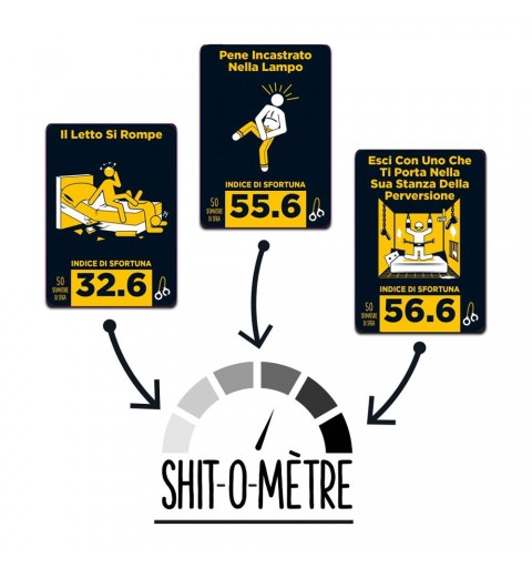 Shit Happens - 50 Sfumature di sfiga è il party game a luci rosse della linea Shit Happens. Rigorosamente per giocatori dai 18 anni in su, ti mette di fronte alle situazioni che sfuggono di mano in ambito intimo. Prepara i fazzoletti per le risate, o per nasconderti dai tuoi amici.Giocare a Shit Happens - 50 sfumature di sfiga è molto semplice: non devi fare altro che collezionare le carte sulle sfortune assurde relative ai momenti più intimi della tua vita . Rifletti bene con ogni carta e classificala nel modo giusto sullo SHIT-O-METRO, una scala di sfortune assurde relative ai momenti più intimi della tua vita appositamente studiata da un Team di esperti. Posiziona correttamente la carta per vincerla! Quando raggiungi 10 carte hai vinto! La confezione contiene: 200 carte con TRAGICHE situazioni Hot, manuale di istruzioni.