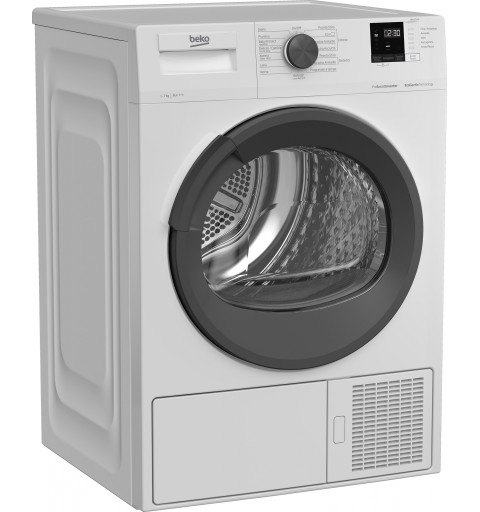 Beko DRXS737AI. Posizionamento dell'apparecchio: Libera installazione, Tipo di carica: Caricamento frontale, Sistema di asciugatura: Pompa di calore. Capacità cestello: 7 kg, Classe efficacia di asciugatura: A, Programmi di asciugatura: Cotone, Delicati/Seta, Jeans/denim, Sintetico, Programmato, Lana. Classe efficienza energetica: A+++, Consumo energetico: 1,26 kWh, Consumo energetico annuo: 159 kWh. Profondità: 537 mm, Larghezza: 597 mm, Altezza: 846 mm. Larghezza imballo: 650 mm, Profondità imballo: 550 mm, Altezza imballo: 885 mm