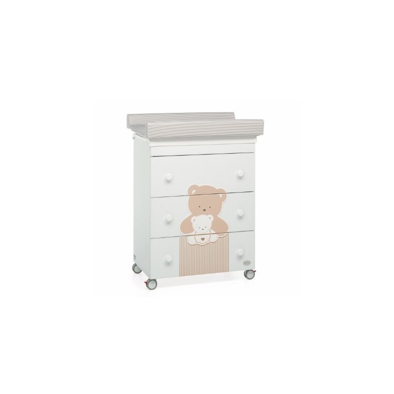 Caratterizzato da tinte classiche e un grande decoro in rilievo con teneri orsetti sui tre ampi cassetti. Ha ruote gommate antigraffio, con sistema frenante, per facilitare gli spostamenti.