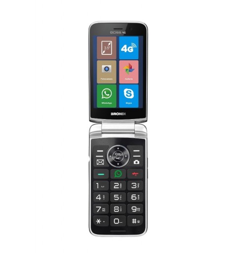 Brondi Boss 4G. Fattore di forma: A conchiglia. Capacità della scheda SIM: Doppia SIM. Dimensioni schermo: 8,89 cm (3.5"), Touch screen. Risoluzione fotocamera posteriore (numerico): 2 MP. Wi-Fi. Bluetooth. Radio FM. Capacità della batteria: 1500 mAh, Autonomia in standby (2G): 170 h. Colore del prodotto: Nero