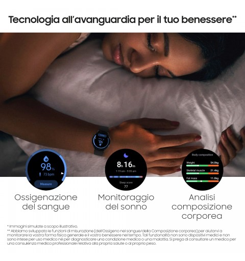 Samsung Galaxy Watch4 40mm Smartwatch Ghiera Touch Alluminio Memoria 16GB Black. Dimensioni schermo: 3,05 cm (1.2"), Tipo di display: SAMOLED, Risoluzione del display: 396 x 396 Pixel, Touch screen. Frequenza del processore: 1,8 MHz, Capacità RAM: 1500 MB, Memoria flash: 16 GB. Wi-Fi. GPS (satellitare). Capacità della batteria: 247 mAh. Peso: 25,9 g. Materiale cinturino: Silicone, Colore cinturino: Nero