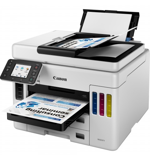 Canon MAXIFY Stampante multifunzione inkjet a colori ricaricabile wireless MegaTank GX7050. Tecnologia di stampa: Ad inchiostro, Stampa: Stampa a colori, Risoluzione massima: 600 x 1200 DPI. Copia: Copia a colori. Scansione: Scansione a colori, Risoluzione di scansione ottica: 1200 x 1200 DPI. Fax: Fax a colori. Funzione duplex: Copia, Stampa, Scansione. Massimo formato carta serie ISO A: A4. Wi-Fi. Stampa diretta. Colore del prodotto: Nero, Bianco