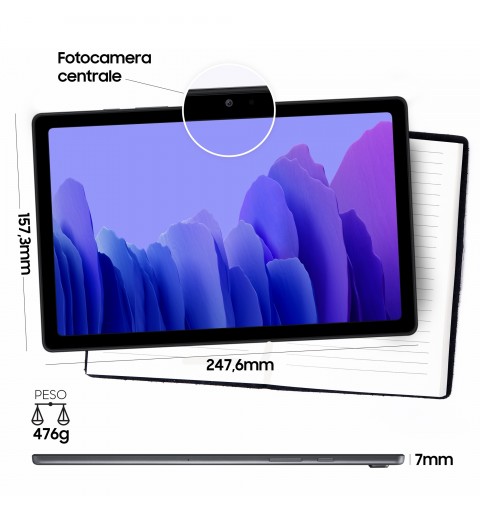 Samsung Galaxy Tab A7 Tablet, Display 10.4" TFT, 32GB Espandibili fino a 1TB, RAM 3GB, Batteria 7.040 mAh, LTE, Android 10, Fotocamera posteriore 8 MP, Dark Gray. Dimensioni schermo: 26,4 cm (10.4"), Risoluzione del display: 2000 x 1200 Pixel. Capacità memoria interna: 32 GB. Frequenza del processore: 1,8 GHz, Famiglia processore: Qualcomm Snapdragon, Modello del processore: 662. RAM installata: 3 GB. Risoluzione fotocamera posteriore (numerico): 8 MP, Risoluzione fotocamera frontale (numerico): 5 MP. Wi-Fi standard: Wi-Fi 5 (802.11ac). Assistenza funzione GPS (A-GPS). Lettore di schede integrato. Peso: 476 g. Sistema operativo incluso: Android 11. Colore del prodotto: Grigio