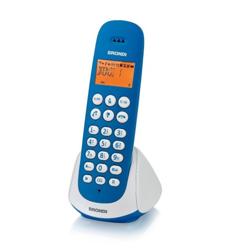 Brondi Adara. Tipo: Telefono DECT, Tipo di apparecchio: Cornetta wireless. Telefono con vivavoce. Raggio d'azione interno: 50 m, Raggio d'azione esterno: 300 m. Capacità rubrica: 20 voci. Identificatore di chiamata. Colore del prodotto: Blu, Bianco. Numero di cornette incluse: 1