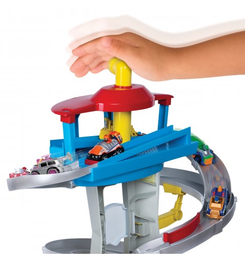 Il set di gioco Adventure Bay Pista da corsa die cast è ricco di funzioni, tra cui la possibilità di far sfrecciare fino a 6 veicoli contemporaneamente. Il set da gioco include versioni esclusive dei veicoli die-cast di Chase e Marshall, ciascuno con design e dettagli autentici, vere ruote funzionanti e metallo die-cast. Premendo il periscopio i cuccioli verranno lanciati in azione per spegnere l'incendio in fondo alla torre, oppure, è possibile attivare il deviatore per inviarli direttamente lungo la rampa di discesa. Sulla base della Torre sono posizionati 2 lanciatori per far sfrecciare più velocemente i veicoli die cast.